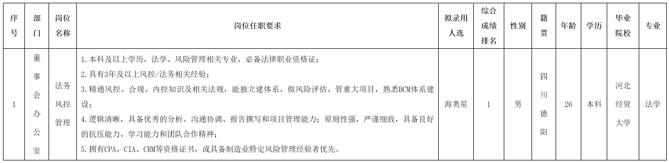 根据四川华丰科技股份有限公司发布的招聘公告及招聘相关规定,经测试等程序,拟录用海类星同志到四川华丰科技股份有限公司工作,现予以公示,具体情况如下: