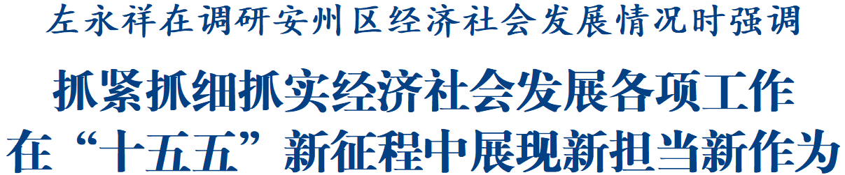 调研过程中,左永祥听取了安州区经济社会发展情况汇报,对取得的工作成效给予肯定。他指出,安州区是绵阳城市新中心的重要承载地,在全市发展大局中具有举足轻重的地位。要切实提高政治站位,完整准确全面贯彻新发展理念,聚焦经济建设这一中心工作和高质量发展这一首要任务,坚持稳中求进、提质增效,努力实现“十五五”良好开局。要培育壮大特色优势产业,坚持创新引领,在全市产业布局中找准主攻方向和细分领域,加快培育壮大先进材料、装备制造等优势产业,深入实施重点产业建圈强链,做深做实“文旅+”文章,多措并举推动一二三产业融合发展,加快构建特色鲜明、竞争力强的现代化产业体系。要深入推进城乡融合发展,统筹推进新型城镇化和乡村全面振兴,一体推进城乡要素、产业、设施、治理融合发展,切实增强城乡经济联系、畅通城乡经济循环,不断缩小城乡发展差距、促进城乡共同繁荣。要进一步保障和改善民生,坚定践行以人民为中心的发展思想,扎实推进教育、医疗、就业等民生事业发展,统筹抓好安全生产、危化品、道路交通、防灾减灾、食品药品安全等重点工作,有效防范化解各类风险,不断增强人民群众获得感、幸福感、安全感。要扎实开展树立和践行正确政绩观学习教育,始终保持严的基调和实的作风,一体推进学查改,力戒形式主义,强化过程管理,持续落实好“双提双解”常态化工作机制,真正做到为人民出政绩、以实干出政绩。