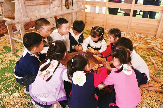 洛水溪谷景区,孩子们体验剥玉米。李静洁 摄