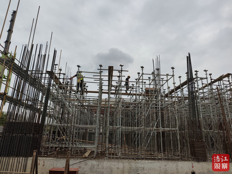 施工现场,80余名建设者正分散在各个作业面紧张忙碌。钢筋工们弯腰俯身,熟练地将一根根钢筋精准绑扎成规整的骨架,间距均匀、绑扎牢固;木工小组默契配合,快速完成模板的测量、切割与支设,确保结构尺寸丝毫不差;不远处,一台醒目的红色混凝土泵车随时待命,这台大型设备承担起混凝土高效输送与精准灌注的重任,确保浇筑工序连续不间断,为高标准完成主体结构施工提供硬核保障。