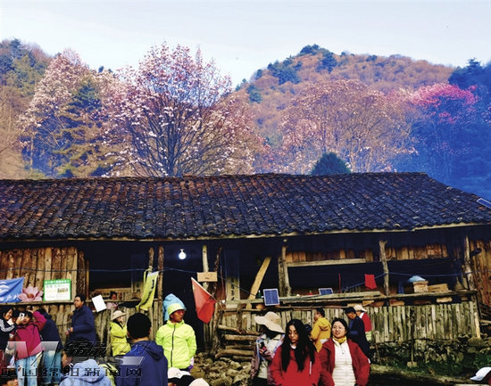 告别小长沟,向西北方向前行约半小时,便来到名为“大猪槽”的地方。宽阔平坦的高山草甸之上,几株高大苍劲的辛夷古树傲然挺立,树下有一户山居人家,炊烟袅袅,鸡犬相闻,繁花、草甸、民居相融相依,身着汉服的游客徜徉其间,美不胜收。
