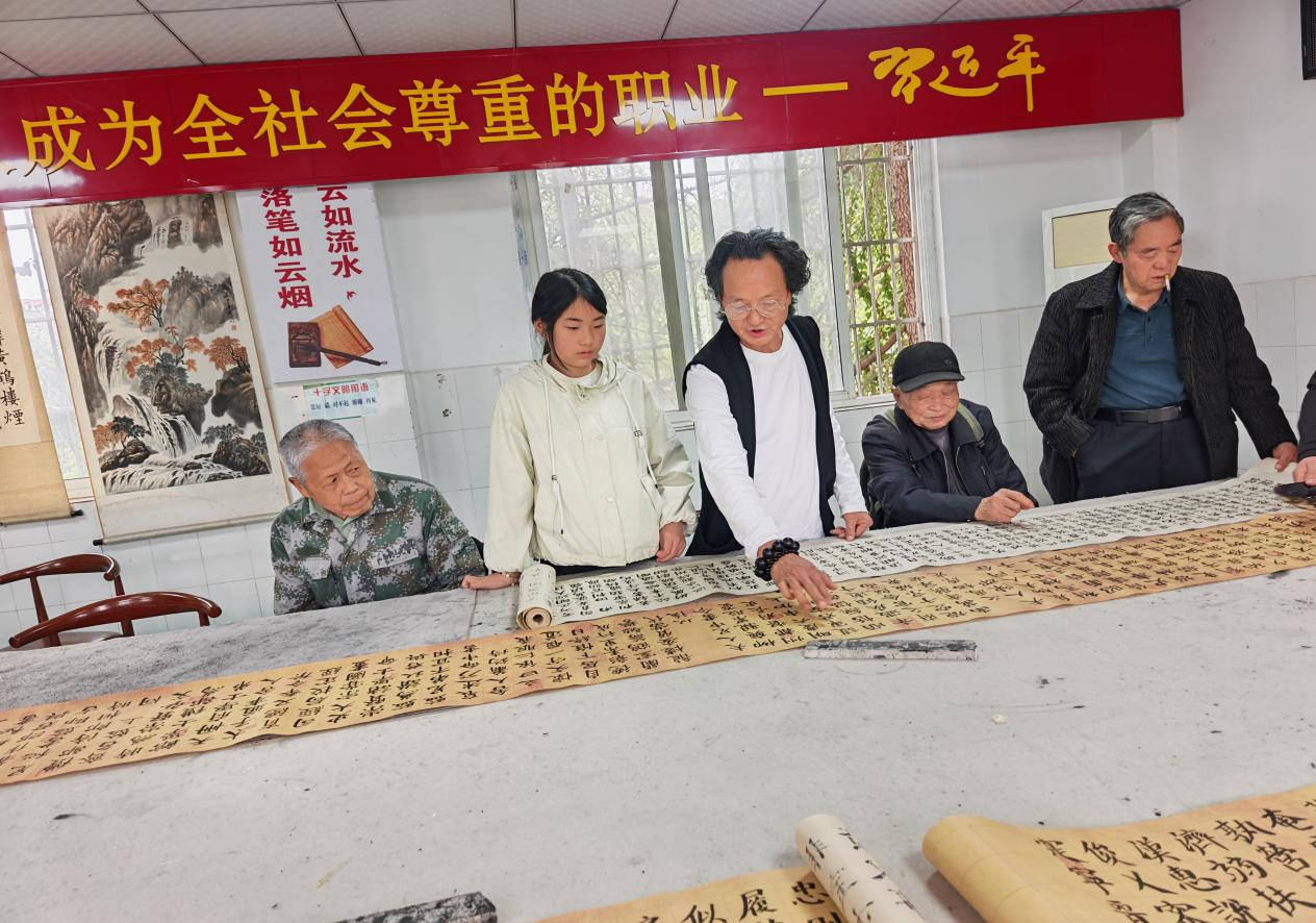 活动现场,魏城小学书法社团学生首先向与会书法家展示了他们临写的《勤礼碑》和《千字文》长卷。一幅幅笔力虽稚嫩却饱含热情的作品,充分展现了孩子们对传统书法的热爱与坚持。与会书法家逐一观摩,并对学生临写情况进行了细致点评与现场指导,鼓励他们在临摹中体悟书法精神,提升书写技艺。