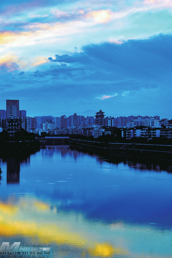 4月8日傍晚,绵阳城区的天际被色彩斑斓的晚霞渲染,如梦如幻。