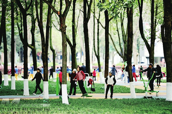 绿树成荫的广场上,健身的人们伴着动感的韵律翩翩起舞。