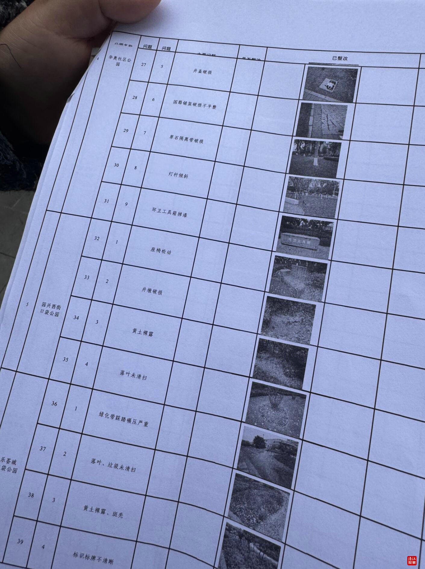 当天上午,在九洲大道华奥社区公园,工作人员手持问题台账,对照该公园的“病历”,对前期排查出的9处问题逐一核查:此前松动的雨水箅子已完成加固,现场销号;新补植的草坪绿意盎然;晃动的座椅也已焊接牢固……