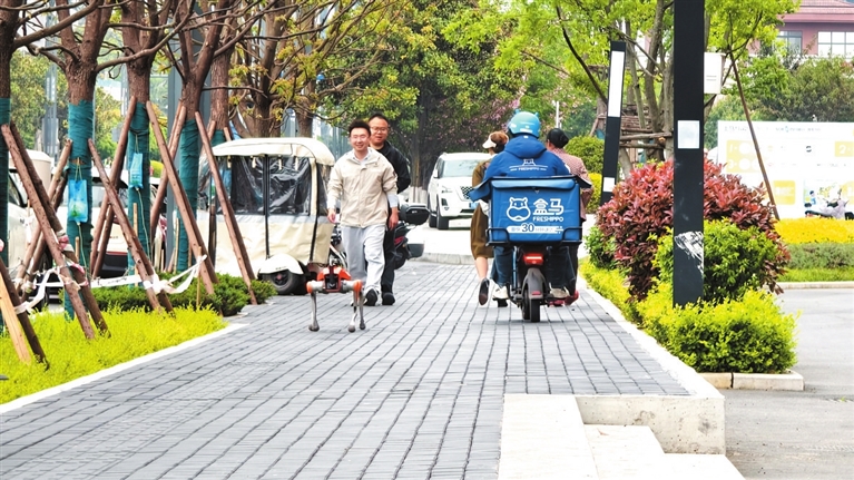 2.0版本“启明”智能机器导盲犬在街头行走。 记者 杨方彧 摄