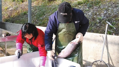工人捕捞虹鳟。 记者 刘曾太 摄