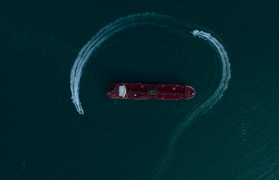 图为2019年7月21日,在霍尔木兹海峡附近水域,伊朗伊斯兰革命卫队船只在被扣押的一艘英国油轮周围游弋。新华社/伊朗学生通讯社