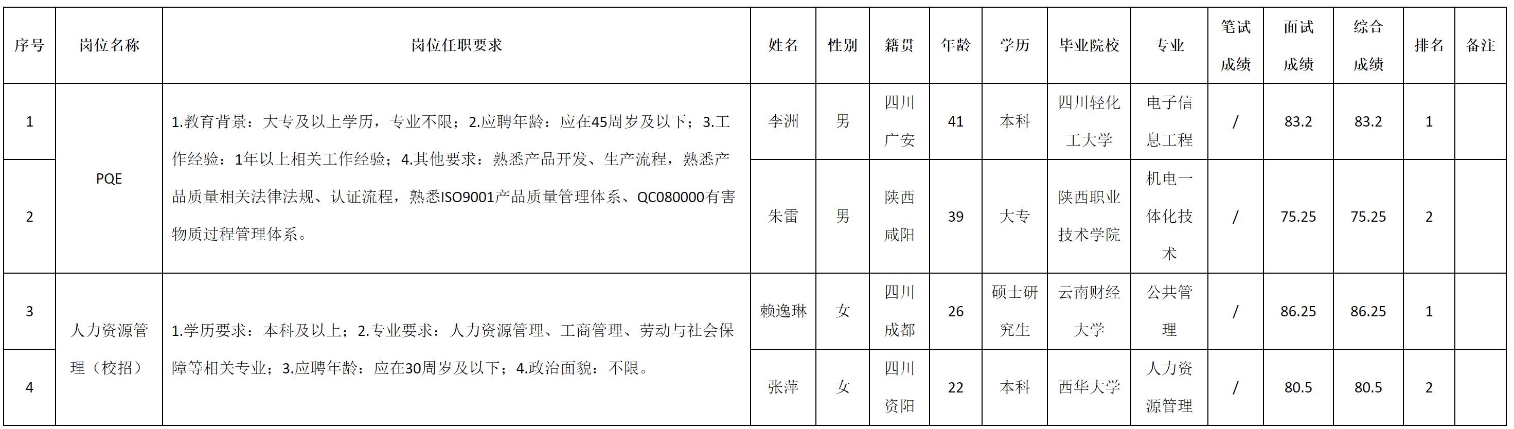 根据四川九州电子科技股份有限公司发布的招聘公告及招聘相关规定,现将测试成绩予以公示。