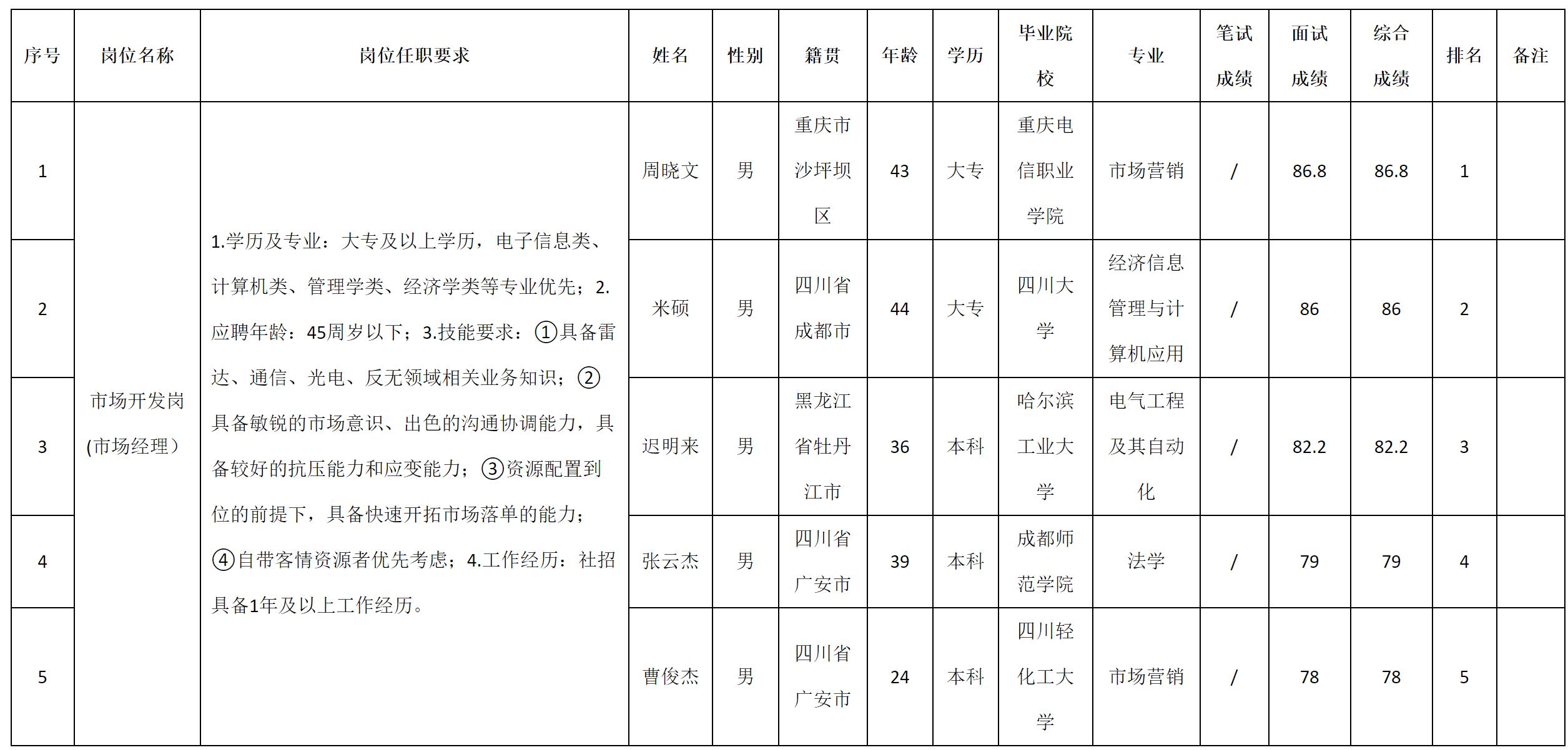 根据四川九洲电器集团有限责任公司发布的招聘公告及招聘相关规定,现将测试成绩予以公示。