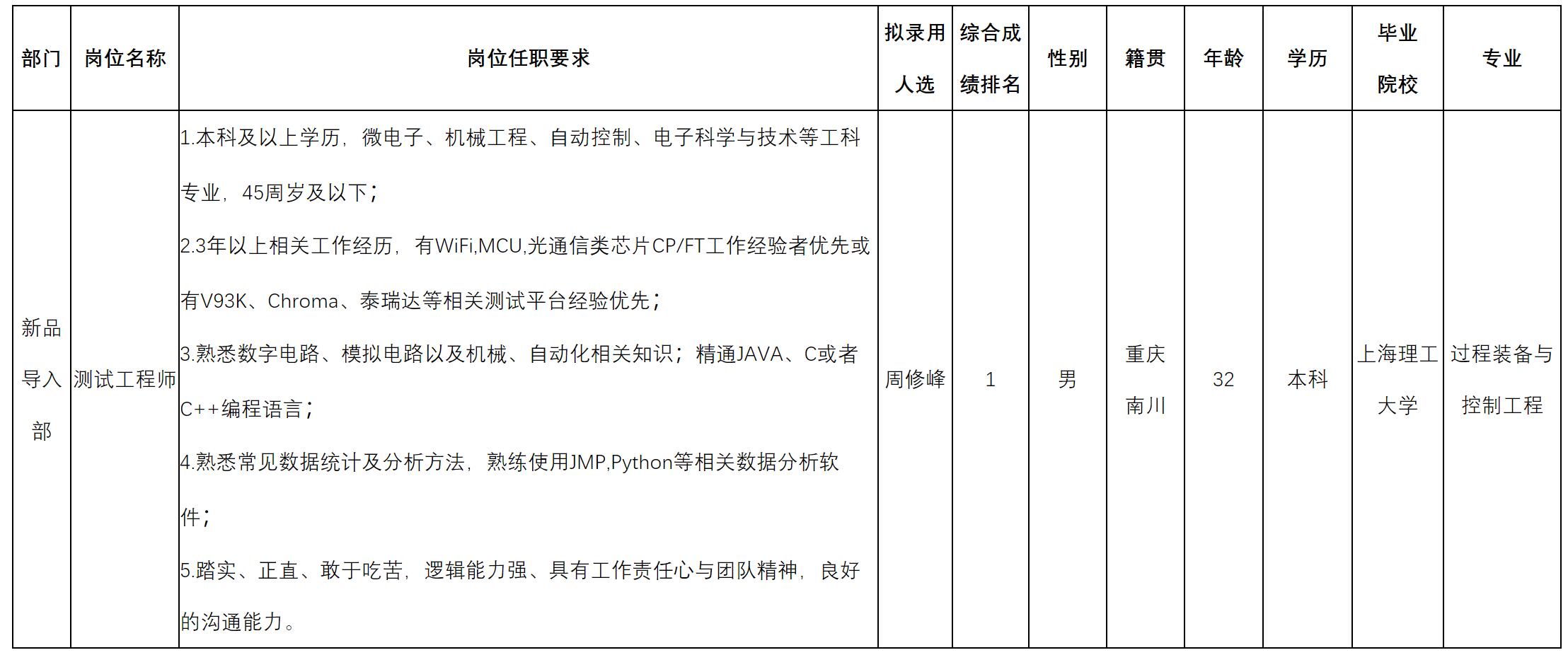 根据四川启赛微电子有限公司发布的招聘公告及招聘相关规定,经用人单位面试程序,拟录用周修峰同志到四川启赛微电子有限公司工作,现予以公示,具体情况如下: