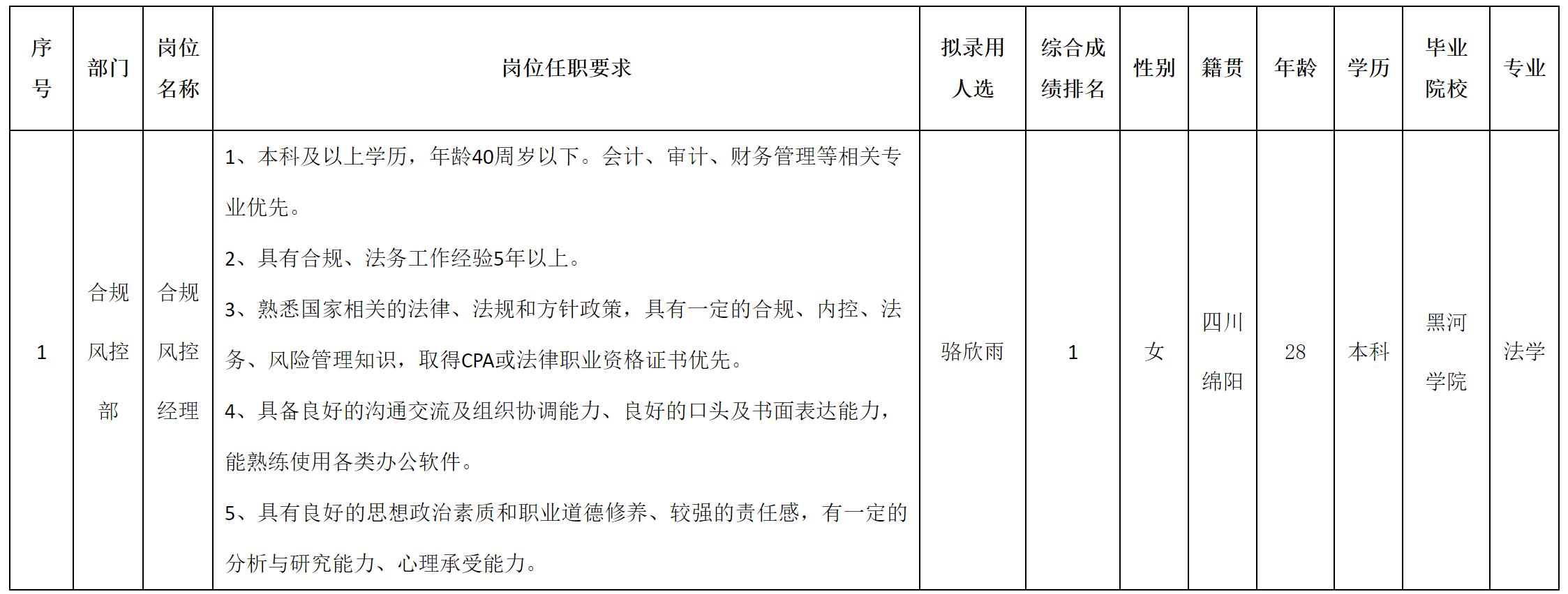 根据四川长虹民生物流股份有限公司发布的招聘公告及招聘相关规定,经面试、考察、体检等程序,拟录用骆欣雨同志到四川长虹民生物流股份有限公司工作,现予以公示,具体情况如下: