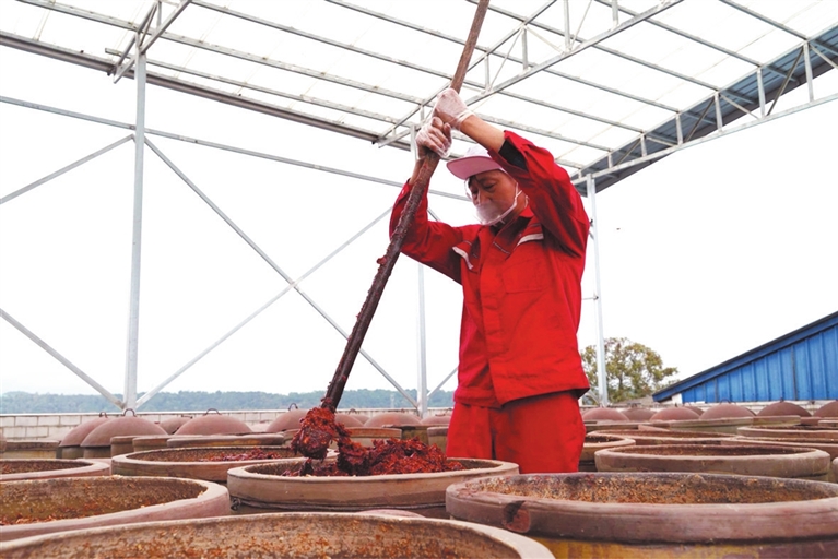 在坚守传统酿造工艺的同时,企业也持续推进技术革新。从事红酱生产近30年的工人赖红兵,亲眼见证了产业从纯人工操作向智能化生产的转变。“10年前,纯手工罐装,一人一天只能装七八十桶;现在,智能灌装机12秒装一桶酱,装两三百桶酱轻轻松松,还可以智能计称。”赖红兵说。