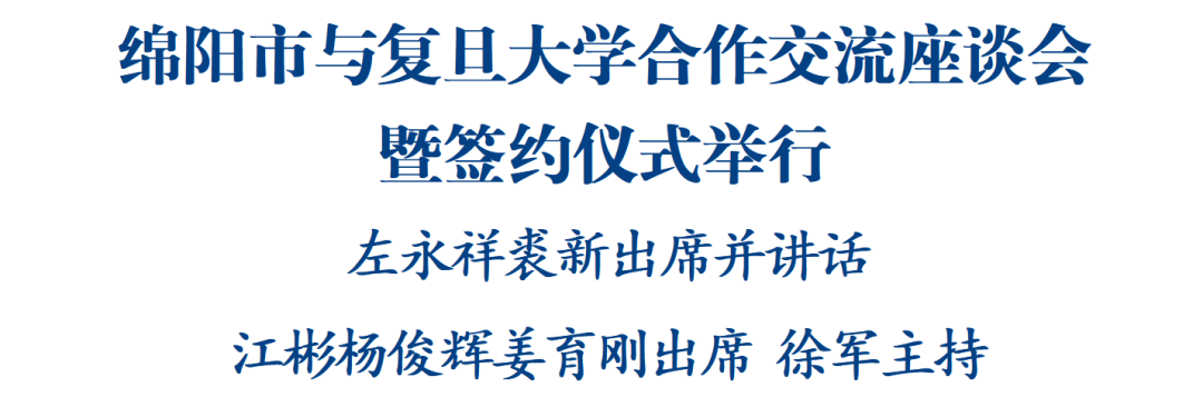 绵阳新闻网讯 4月13日,绵阳市与复旦大学合作交流座谈会暨签约仪式在复旦大学举行。省委常委、市委书记左永祥,复旦大学党委书记裘新出席座谈会并讲话。市委副书记、市长江彬,西南科技大学党委书记杨俊辉,复旦大学党委常委、副校长姜育刚出席座谈会;复旦大学党委常委、上海医学院党委副书记、副院长徐军主持座谈会。