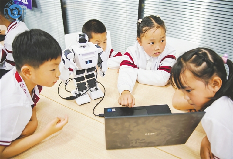 孩子们在老师指导下挑战机器人编程任务。记者 谢艳 摄