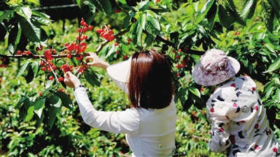 盐亭县巨龙镇花果嫘乡现代农业产业园内,翠绿枝叶间,朱砂樱桃、中华大樱桃两个品种果实缀满枝头,圆润饱满、脆甜多汁,果香扑面而来。今年光照充足、气候适宜,樱桃品相与口感均优于往年,每日接待游客百余人次,周末更是人气爆棚,果品供不应求。“亲自采摘新鲜又有趣,樱桃清甜可口,这趟自驾行程特别值得。”从内江前来的游客黄思淇赞叹道。
