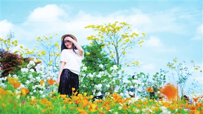游客在安州区黄土镇百花乐园里拍照。记者 安峥 摄