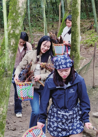 游客在北川神木寨山坡上采摘春笋。记者 唐舒琪 摄