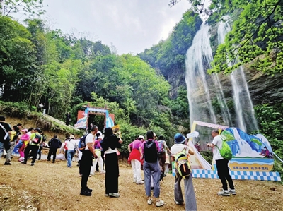 徒步爱好者们在北川紫霞山大瀑布景点打卡。记者 唐云峰 摄