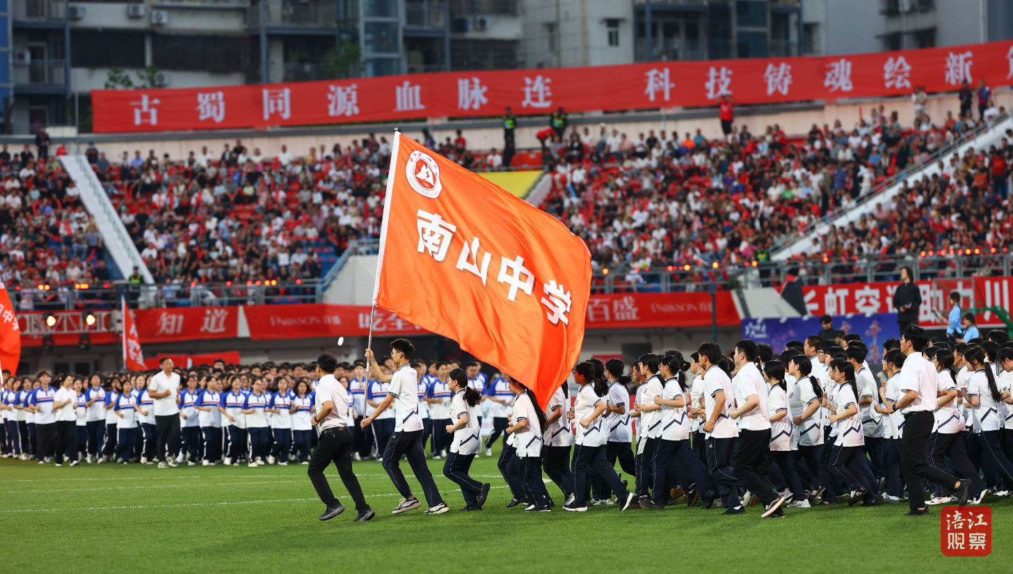赛前展演以少年中国・思政引领开篇。情景表演回溯觉醒年代的爱国热血,舞蹈与情景剧交织,唤醒全场家国情怀。来自绵阳8所中学的1600名学子组成庞大方阵,步伐整齐、气势如虹,依次庄严“向祖国报到”,齐声许下青春誓言。铿锵有力的话语响彻赛场,不少观众自发起立鼓掌,不少学生家长热泪盈眶。