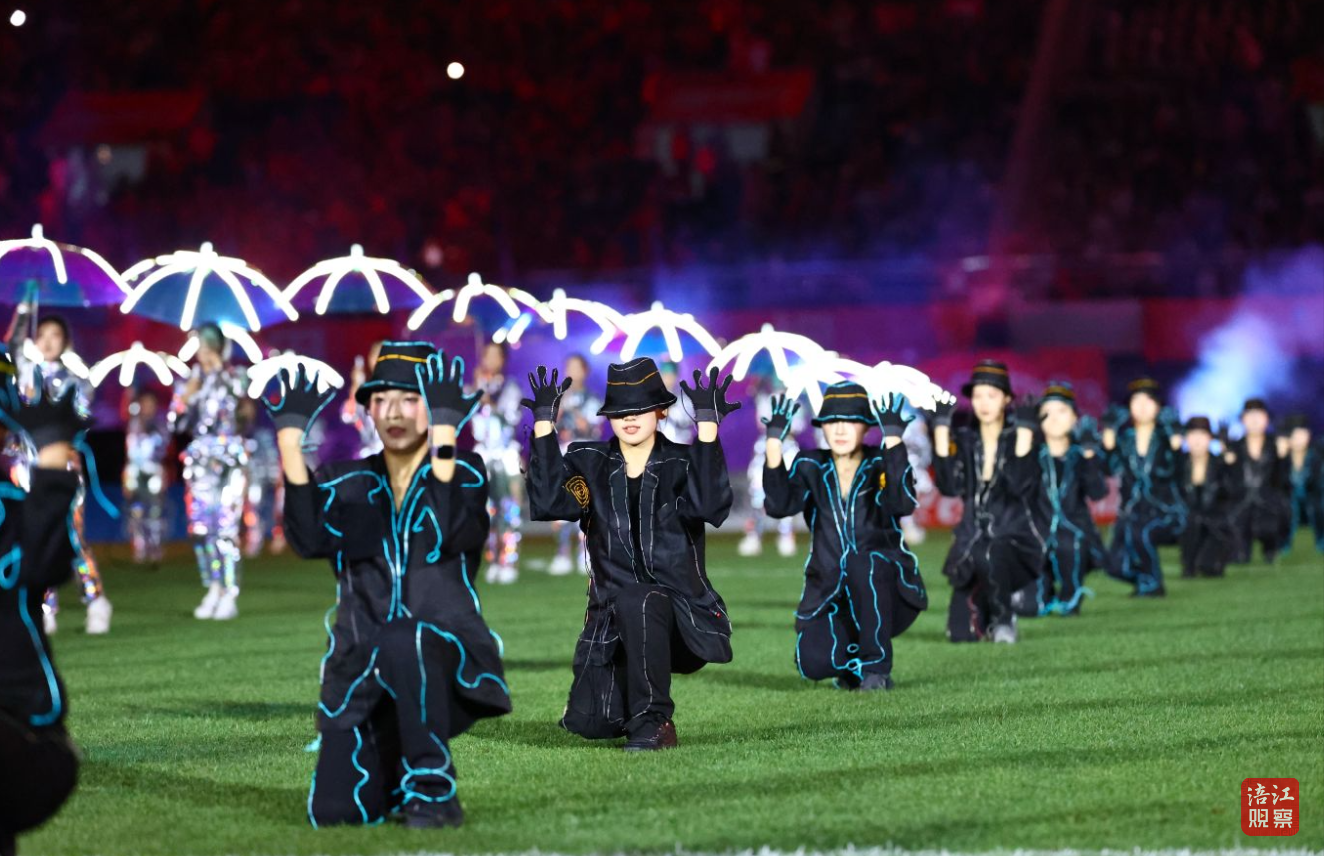 发光伞舞与流行舞灵动切换,演员与大屏画面深度互动,沉浸式、场景化的表演让观众眼前一亮。“太震撼了!原来我们科技城新区这么有科技感、这么热闹!”现场球迷王先生举着手机拍照录像,分享给亲友。光影流转间,科技城新区“产业高地、城市新中心”的形象深入人心,掌声与欢呼声一浪高过一浪。