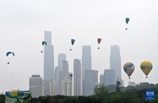 4月19日,2026年“广西三月三·八桂嘉年华”文化旅游品牌活动继续在南宁市民歌湖举行,动力伞编队在民歌湖上空表演。