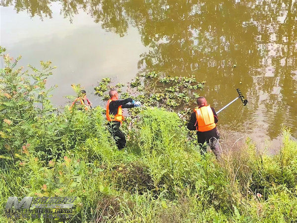 工作人员正在打捞水葫芦。记者 殷琦 摄