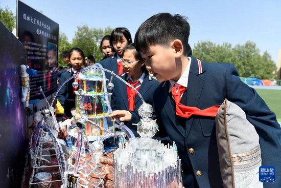 4月20日,在济南市历下区燕山小学,同学们在参观“雏燕启航 筑梦星河”主题美育成果展。