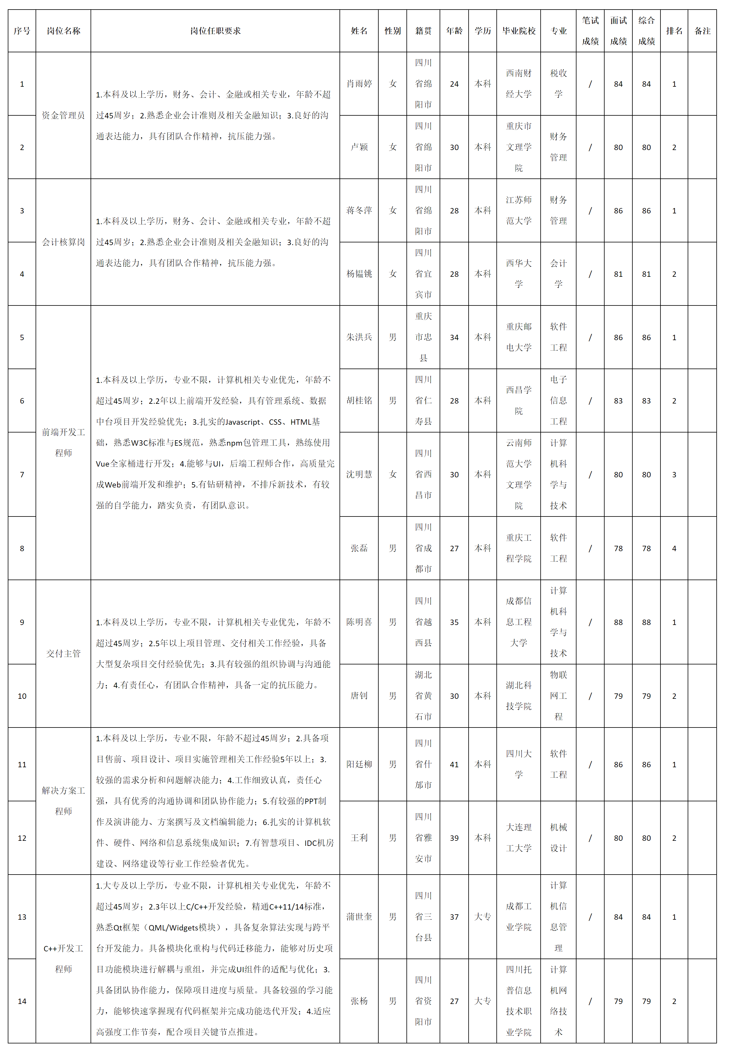 根据四川科瑞软件有限责任公司发布的招聘公告及招聘相关规定,现将测试成绩予以公示。