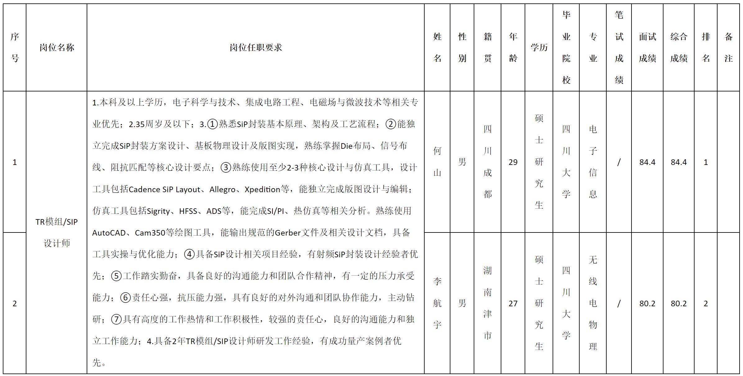 根据重庆嘉旦微电子有限公司发布的招聘公告及招聘相关规定,现将测试成绩予以公示。