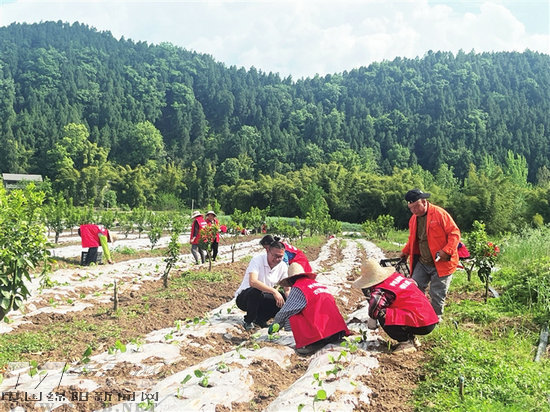 日前,盐亭县玉龙镇的柑橘园里绿意层叠,高处是正在生长的金秋沙糖桔、明日见果树,脚边是新栽下的茄子、辣椒秧苗,正挺着嫩茎。果农们穿行在果树行间,弯腰栽苗,忙个不停。