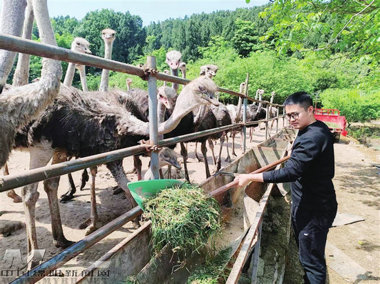 金叶浩正在饲喂鸵鸟。 刘玉明 摄