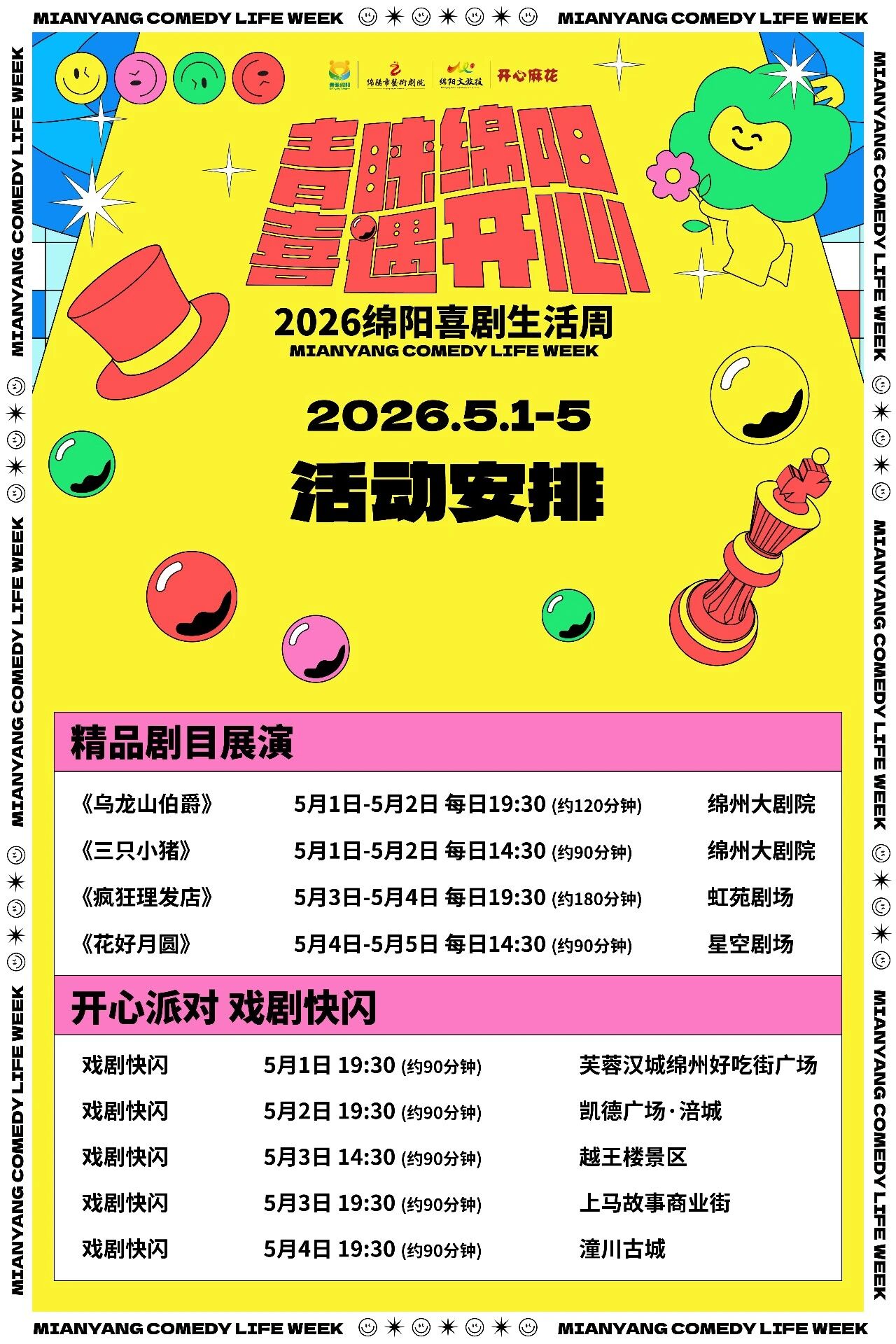 5月1日至5日,“青睐绵阳·喜遇开心”2026绵阳首届开心麻花喜剧生活周将先后在绵州大剧院、虹苑剧场、星空剧场举行,演出剧目包括《乌龙山伯爵》《三只小猪》《疯狂理发店》《花好月圆》等。