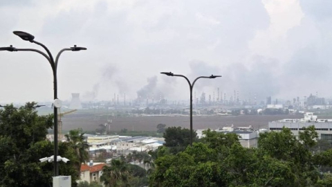 以色列第12频道电视台19日报道说,以色列北部城市海法的炼油厂遭袭,现场画面显示厂区冒出浓烟。 [
