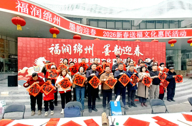 2月1日,绵州大剧院门前广场墨香四溢、红纸铺展,“福润绵州 墨韵迎春”2026新春送福文化惠民活动在此举行。[