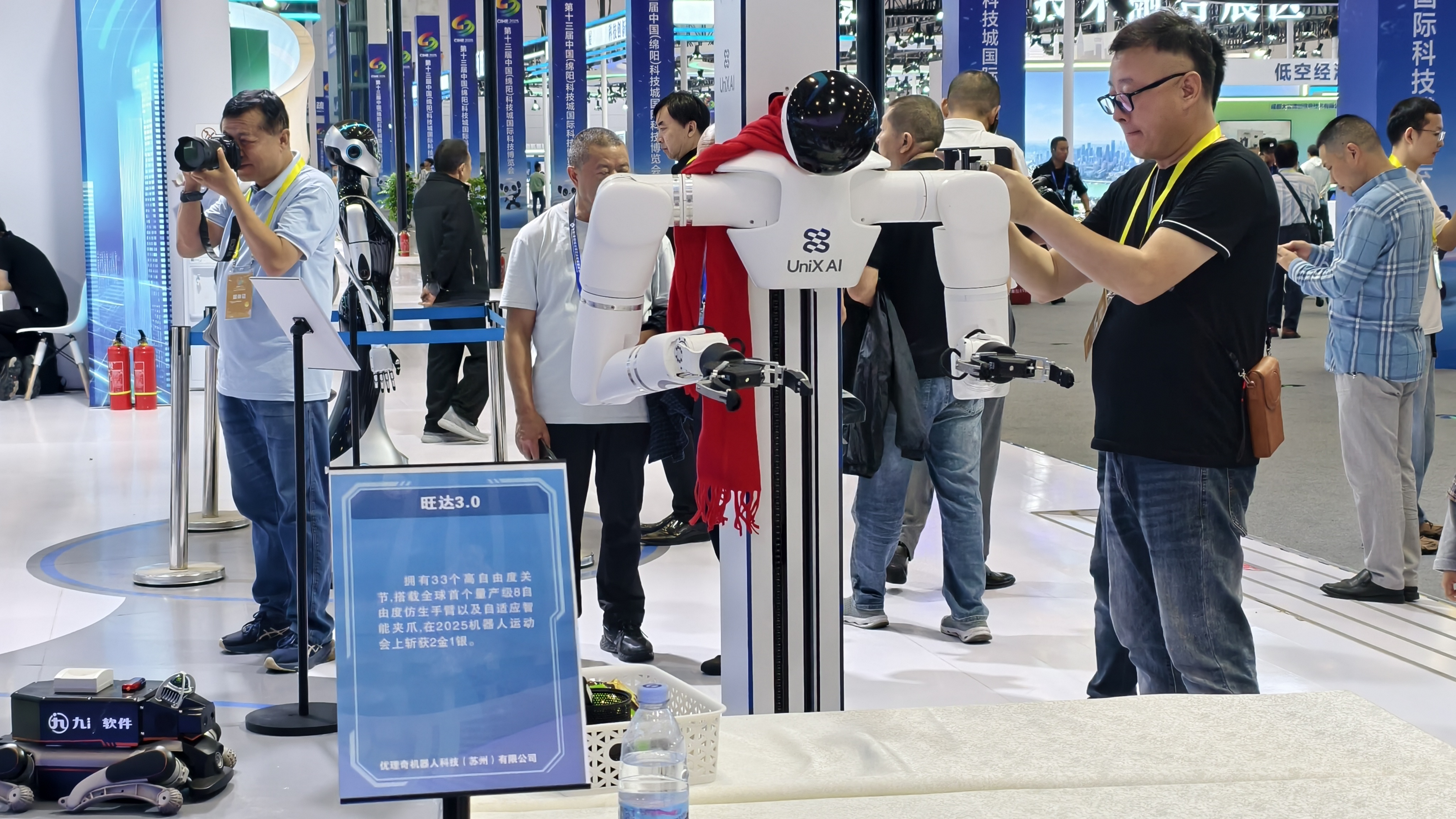 第十三届中国(绵阳)科技城国际科技博览会上,机器人展区前人头攒动。 一台通体白色还戴着红色围脖的人形机器人,正灵活转动手臂,精准抓起水瓶递向观众。随即又稳稳夹住名片,流畅动作引发阵阵惊叹——这便是刚在全球首届人形机器人运动会上包揽服务..[
