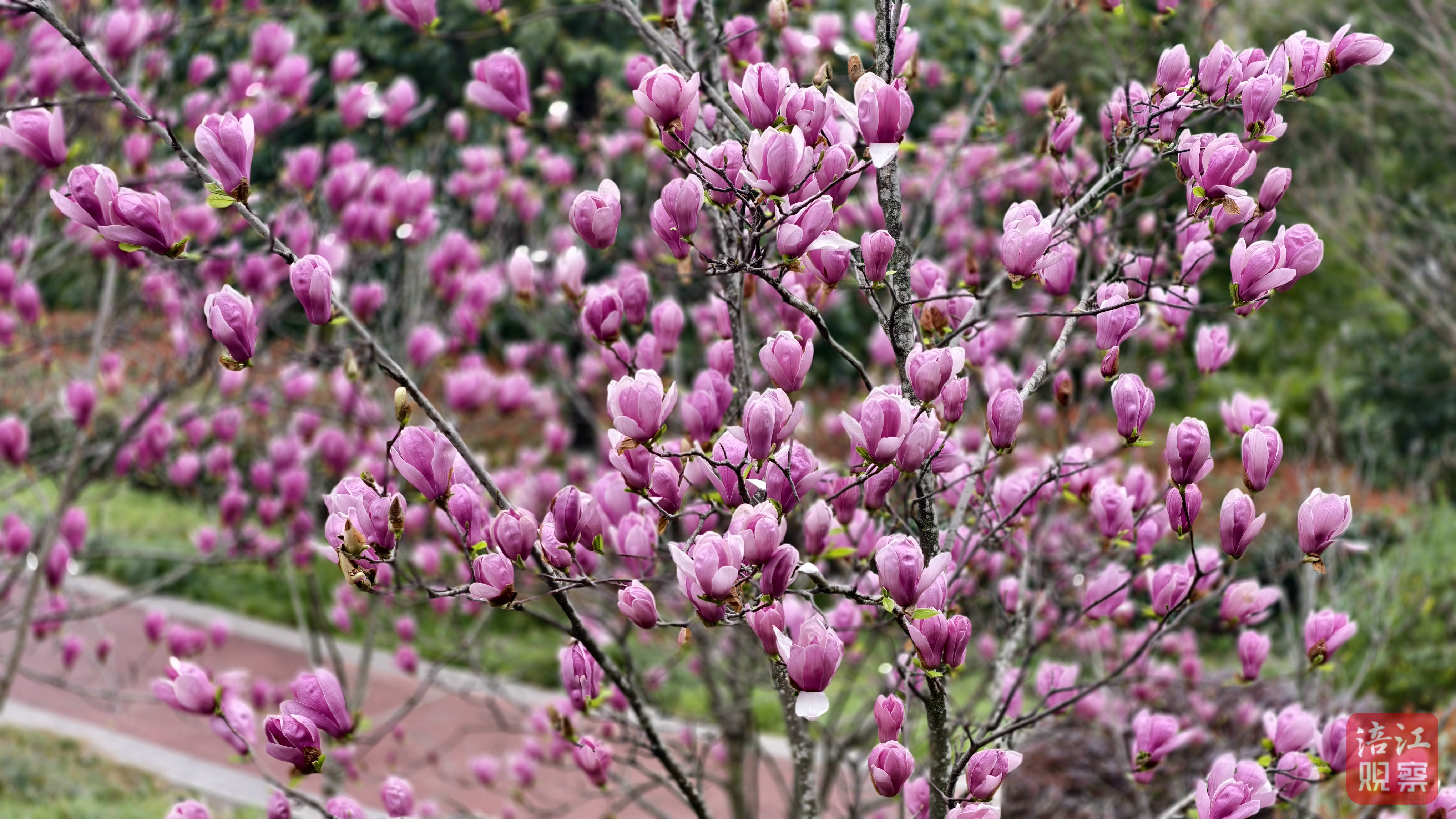 走进西山公园,同样是满园春色关不住。红梅、玉兰、海棠刚刚完成一场绚烂的绽放,山杏和樱花就迫不及待地接过了“接力棒”。 [