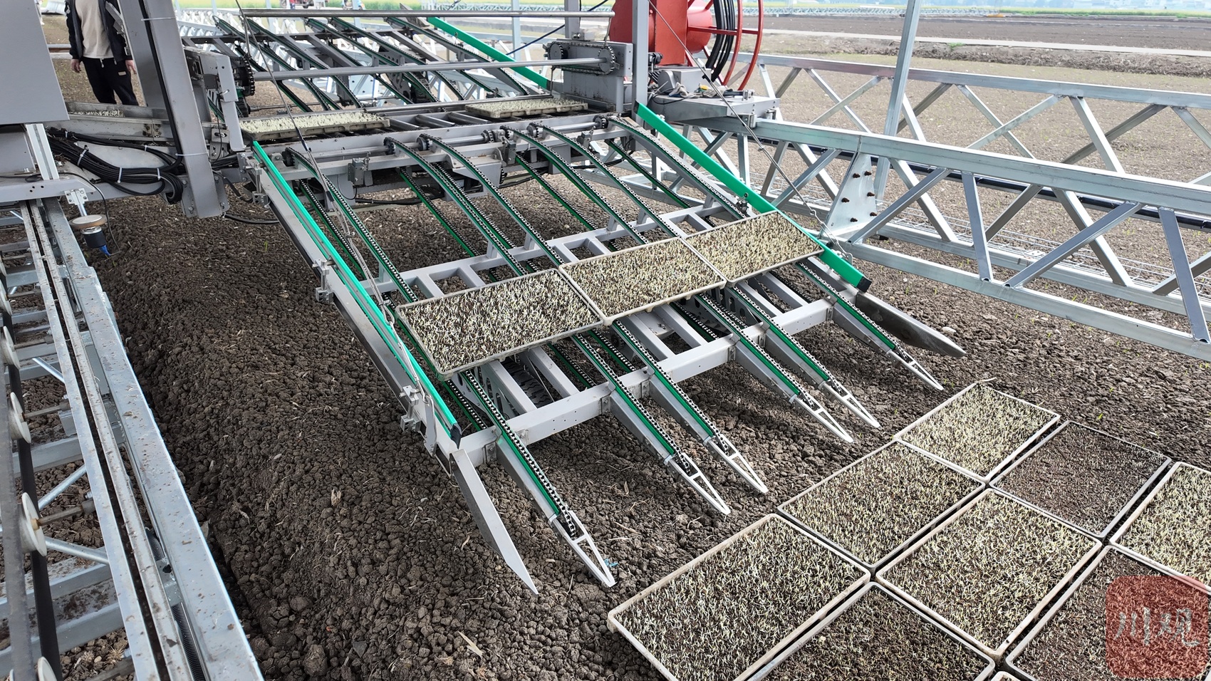4月16日上午,广汉市连山镇锦花村,种粮大户冷辑龙轻轻按下一台“特殊”育秧设备的按钮,传输带随即运转,一盘盘秧苗缓缓移向田间。约1分钟后,40多盘秧盘已被整齐地“种”入田中。“这台新设备效率非常高。”冷辑龙介绍,过去需要20多名工人才能完成的育秧工作,如今3人即可..[